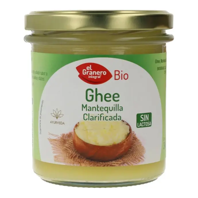 El Ghee es mantequilla clarificada elaborada siguiendo el método tradicional ayurvédico, en el que se calienta la mantequilla lentamente para separar las impurezas y la lactosa, quedando una grasa pura y dorada con un delicado aroma y sabor.